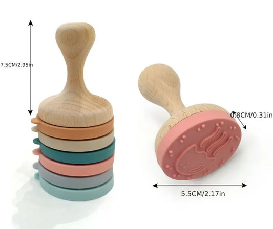 Item will be in stock for Christmas- msg us to hold one from the next shipment! Rubber Stamp with Wood Handle, 4 Interchangeable Silicone Stamps