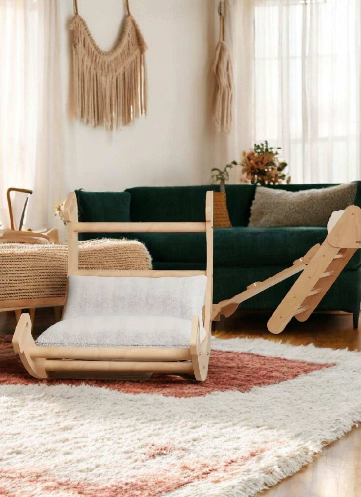Encourage movement, imagination, and independence with our versatile 5-in-1 Pikler Triangle Set! Designed for toddlers and young children, this multifunctional play structure transforms any indoor space into a safe and enriching environment for gross motor development and active play.