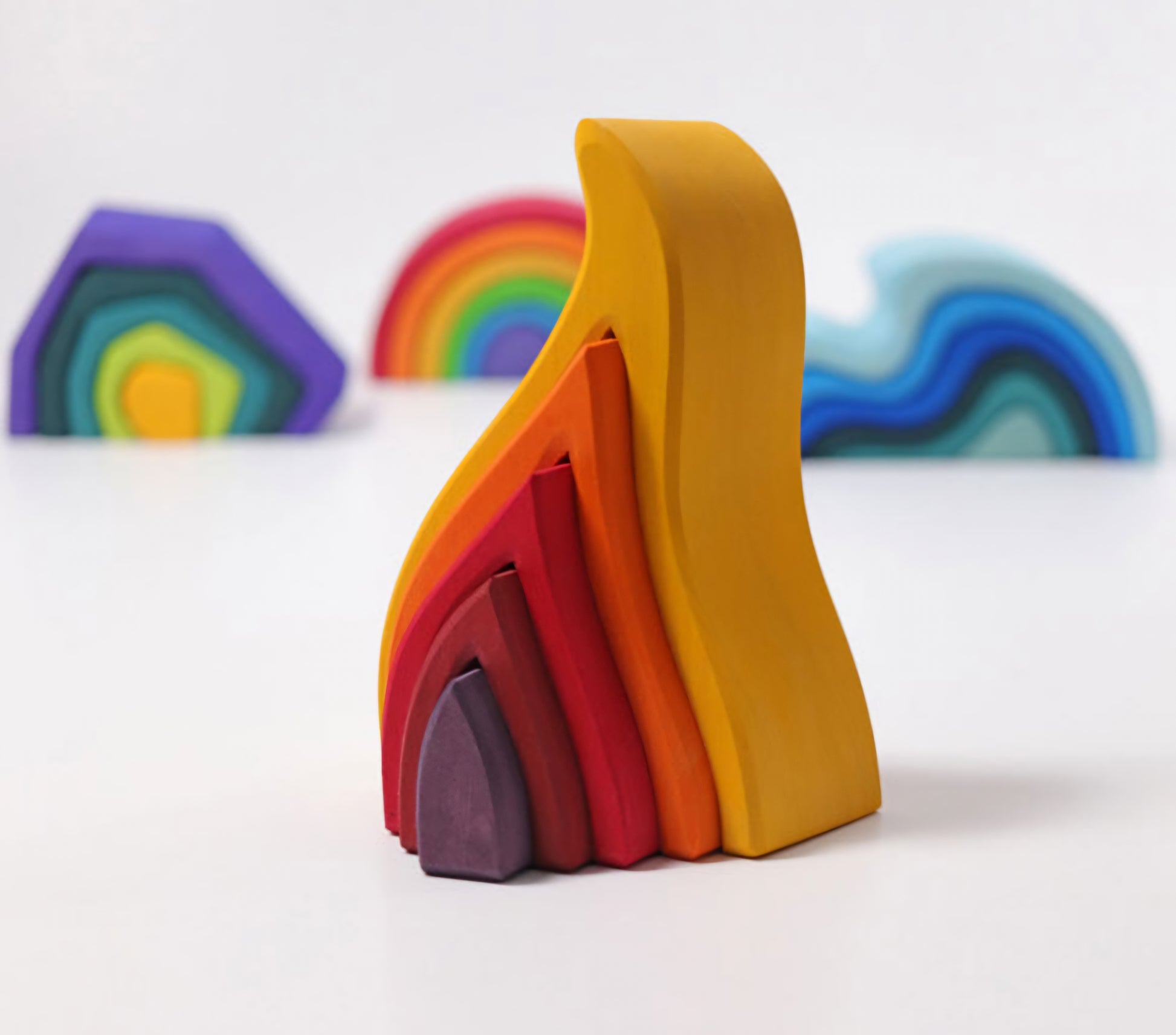 With five flame-shaped arches, children can stack, nest, and arrange these vibrant blocks, transforming them into tunnels, bridges, houses, or use them as colorful components in imaginative play. Suitable for toddlers learning to stack and nest or older children building complex structures, this stacker grows with your child’s development, encouraging creativity and fine motor skills.