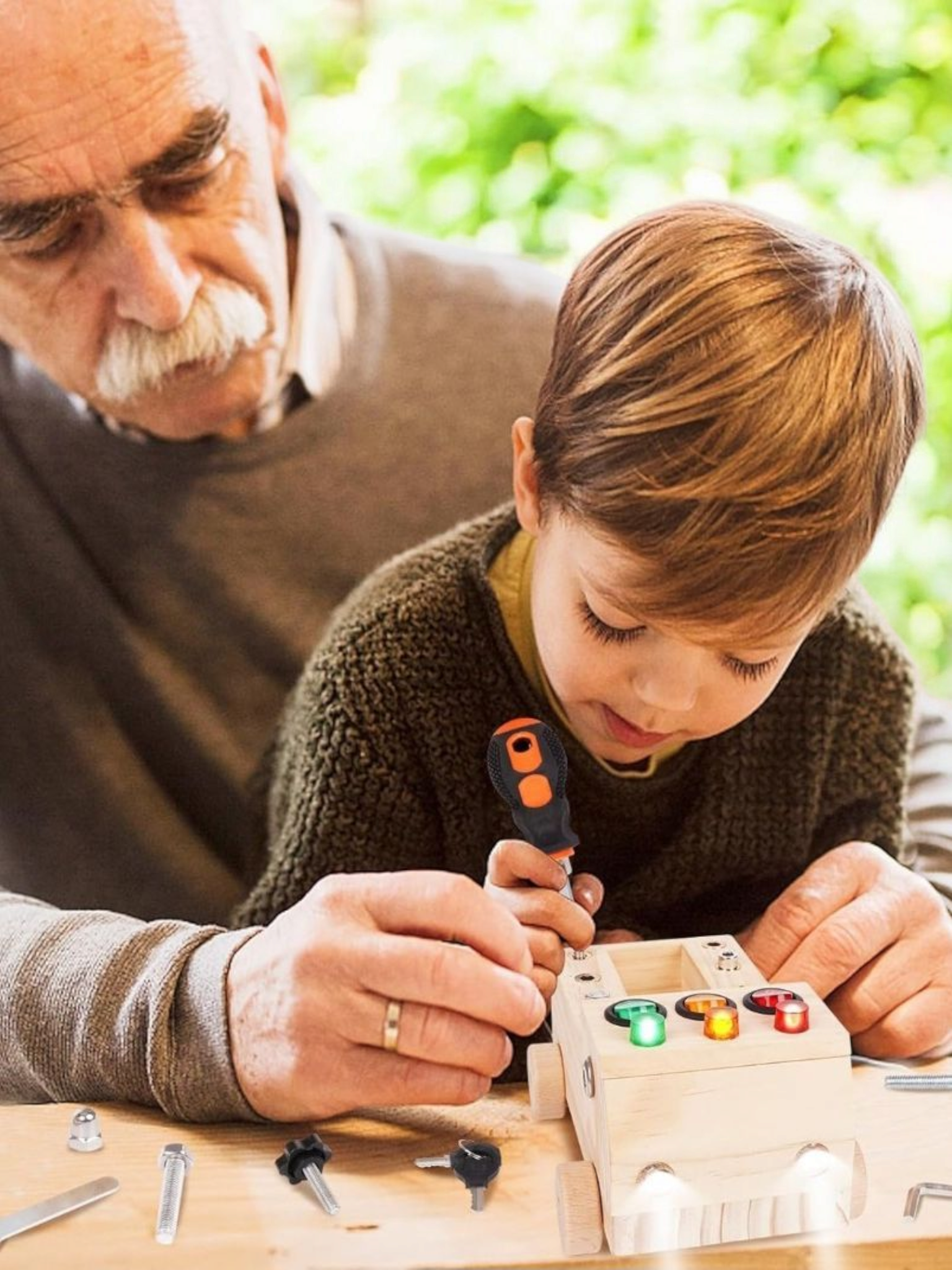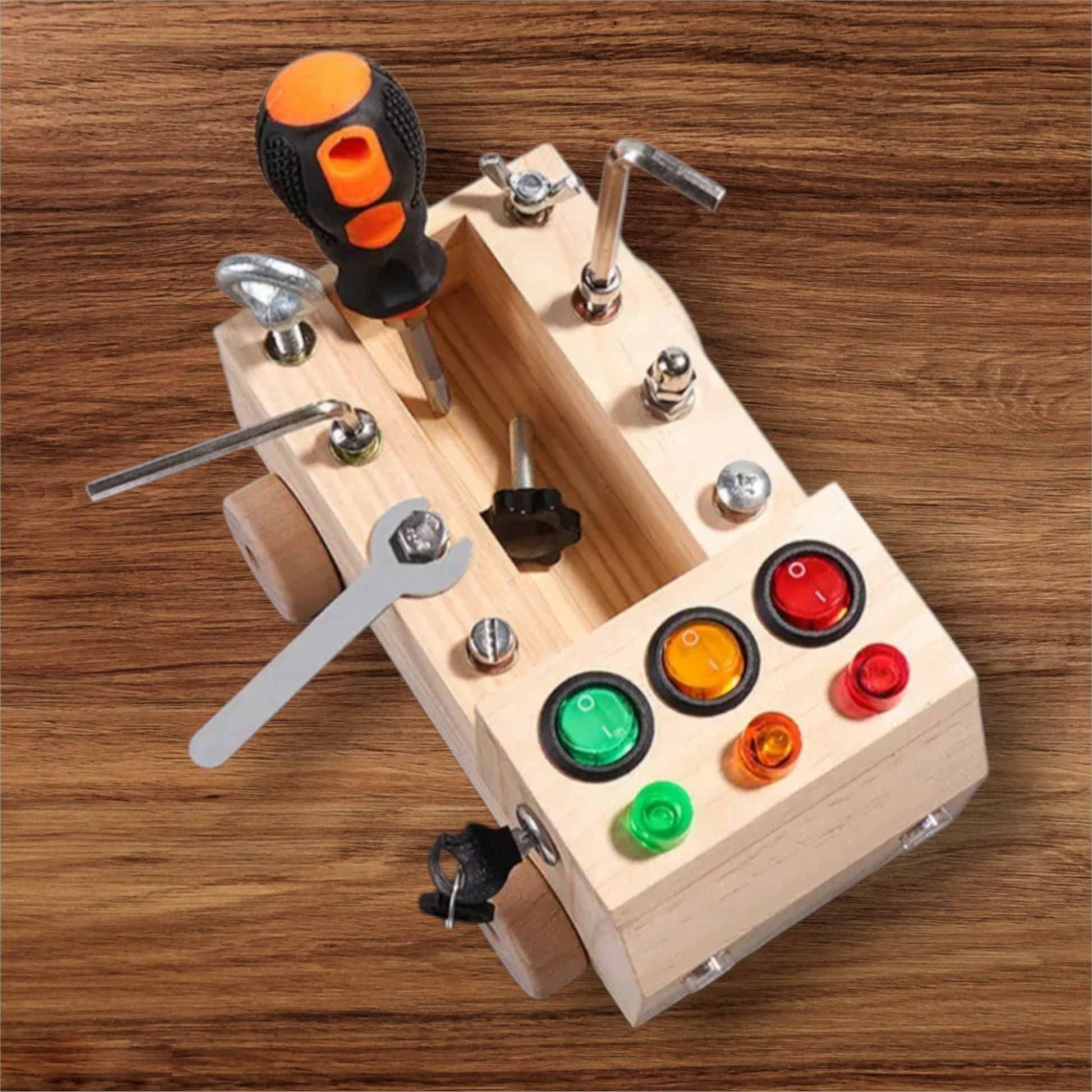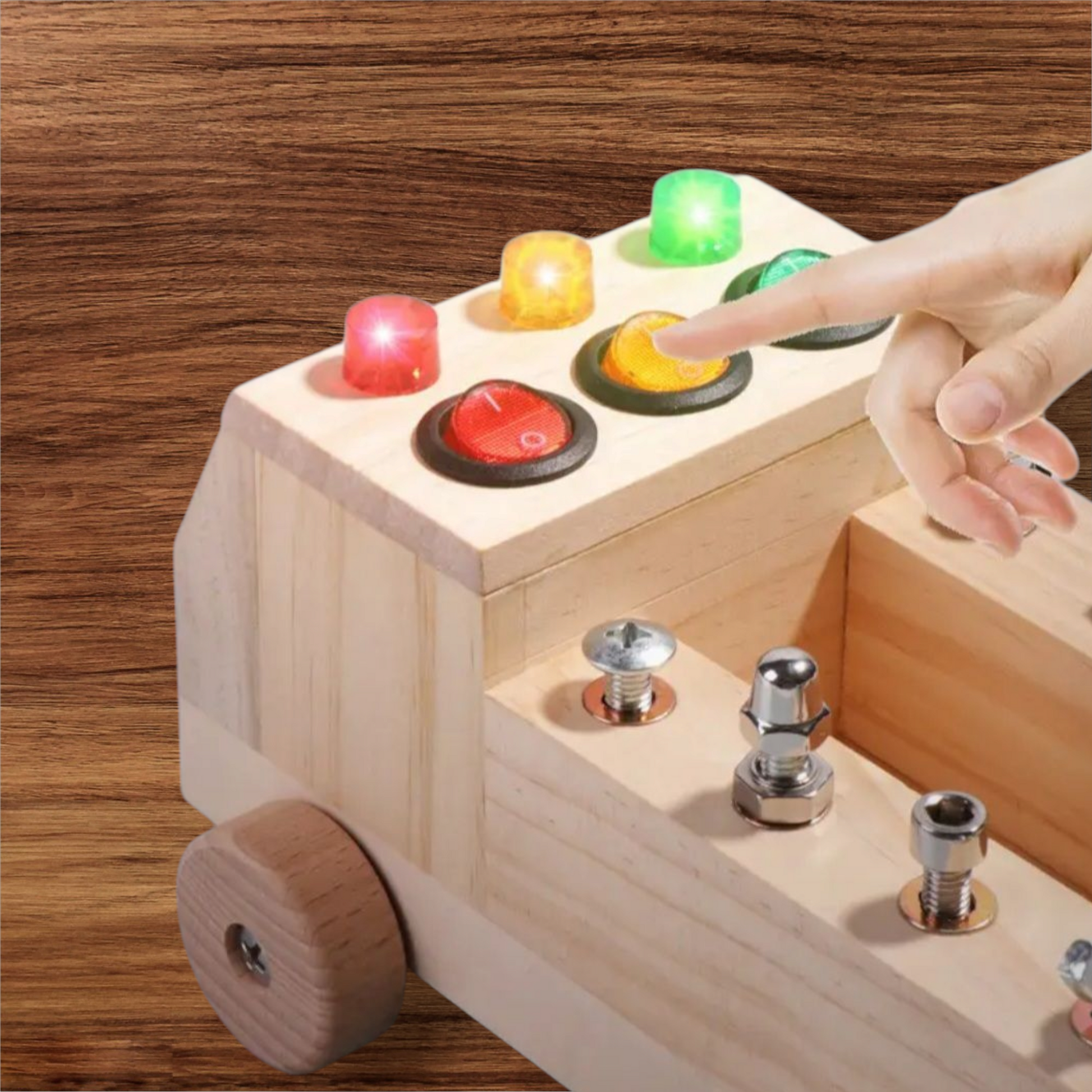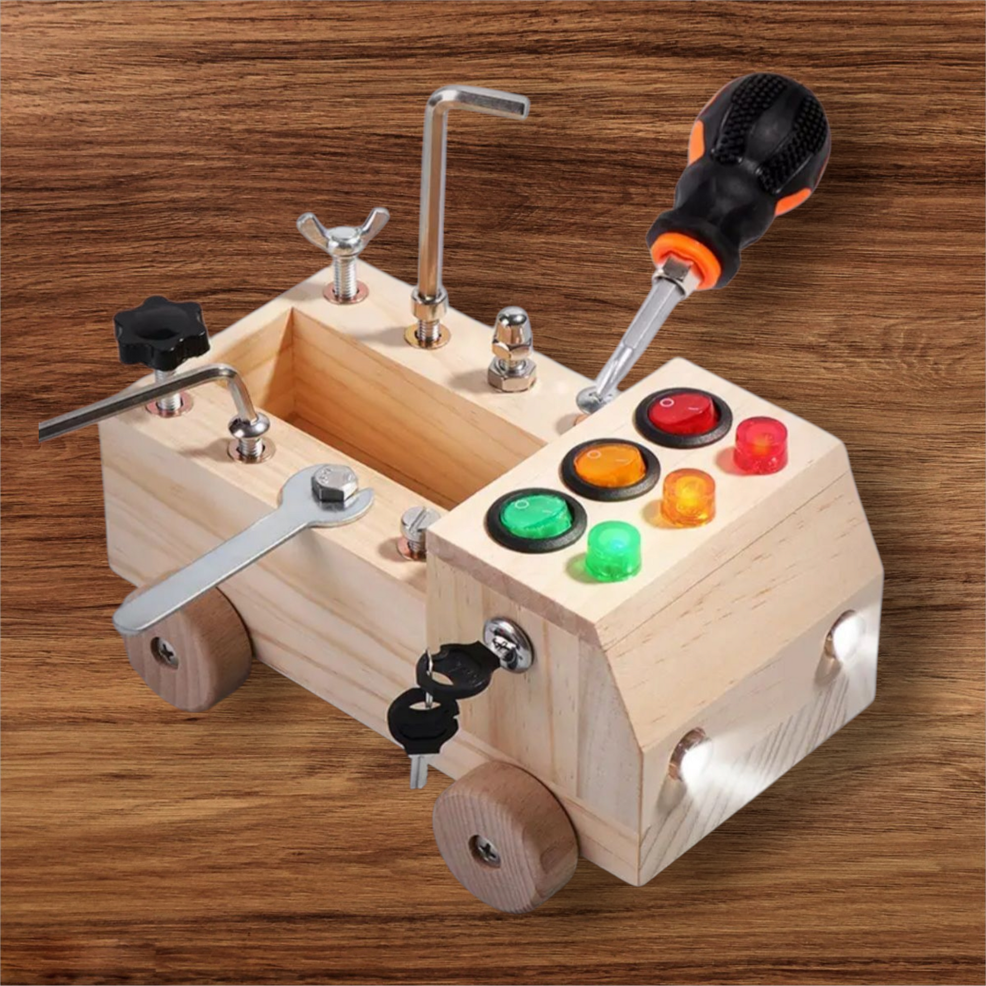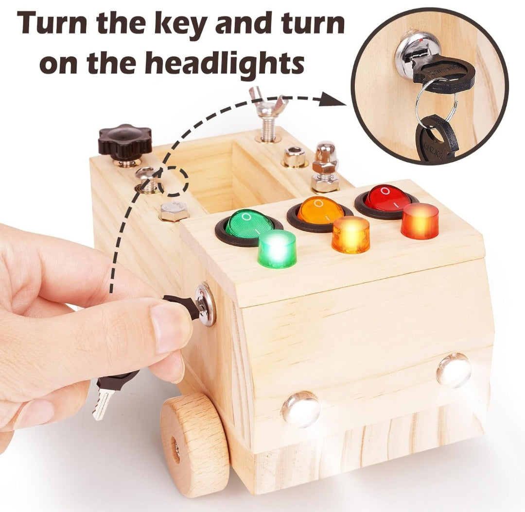 Interactive & Educational: This cleverly designed wooden car features a built-in screwdriver board and LED light switches, letting children explore tools, colors, and cause-and-effect through hands-on play. Kids can even install the wheels themselves!