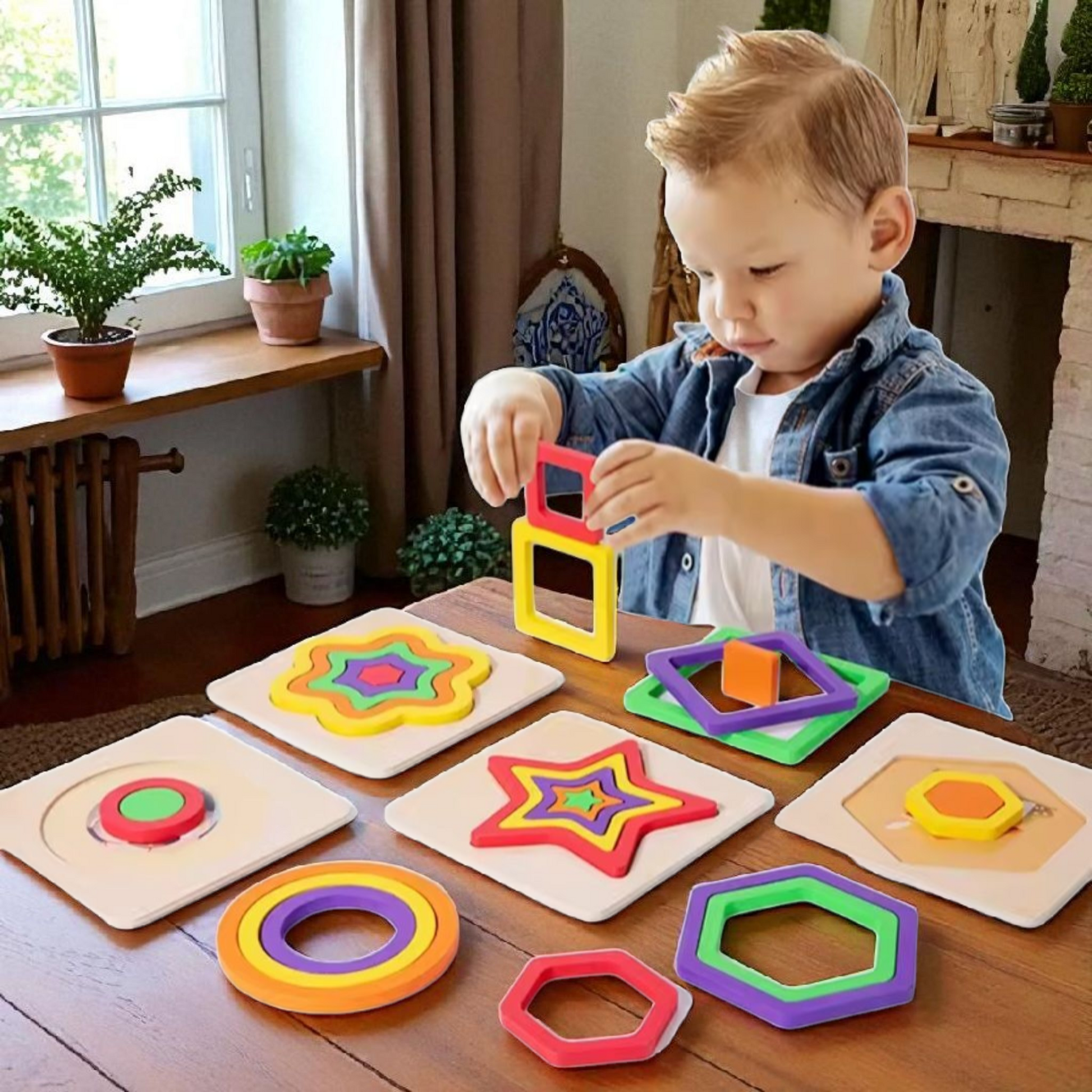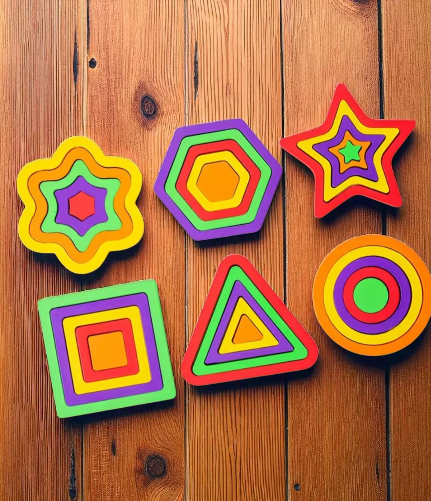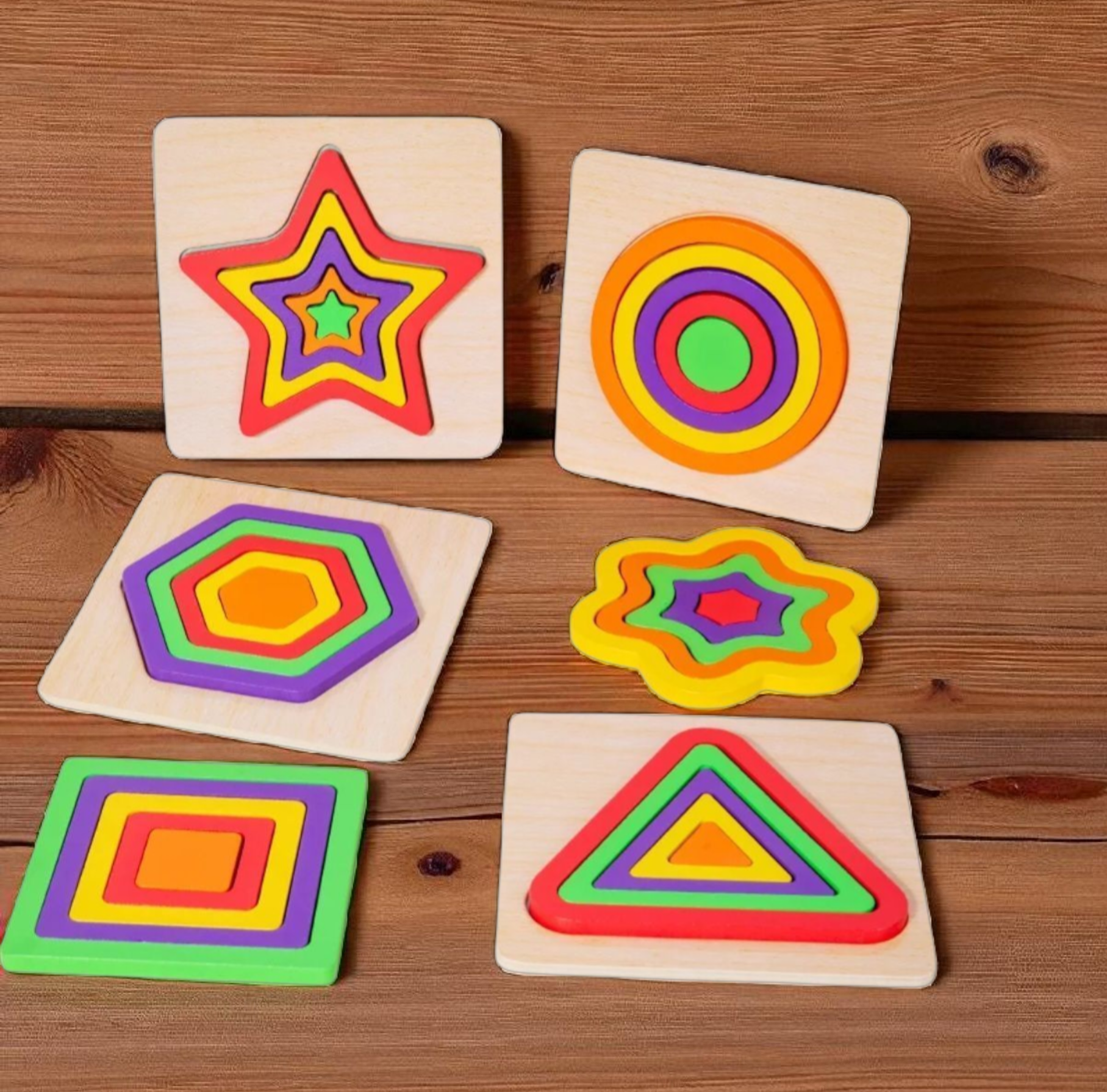 Make learning shapes, colors, and sizes a hands-on adventure! This Montessori-inspired wooden puzzle set includes six shape boards — flower, square, circle, triangle, star, and hexagon — each with matching wooden blocks. Perfect for developing problem-solving skills, hand-eye coordination, and shape recognition in young children.