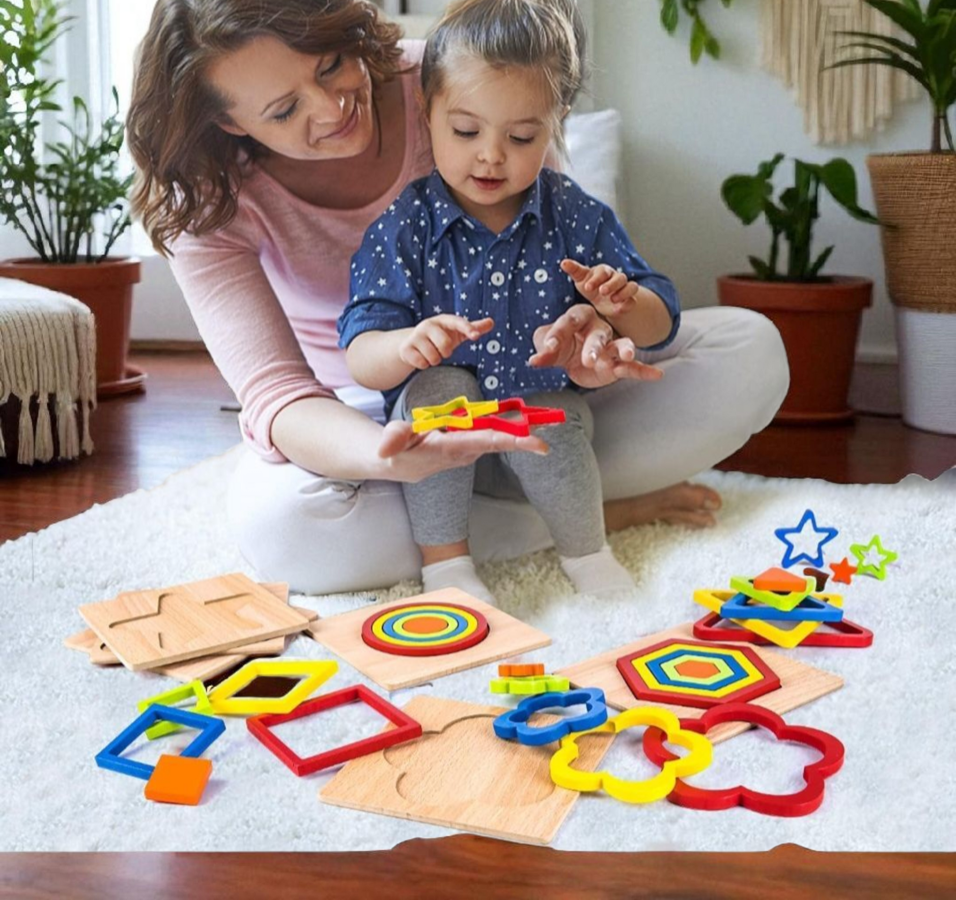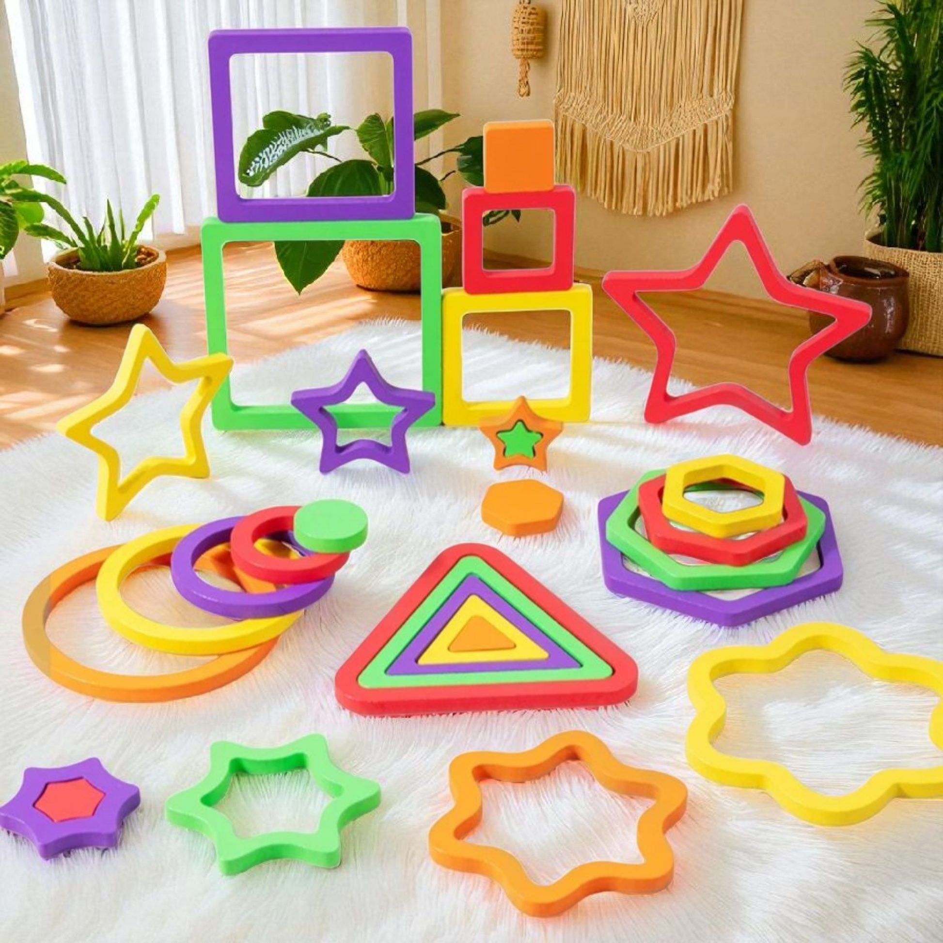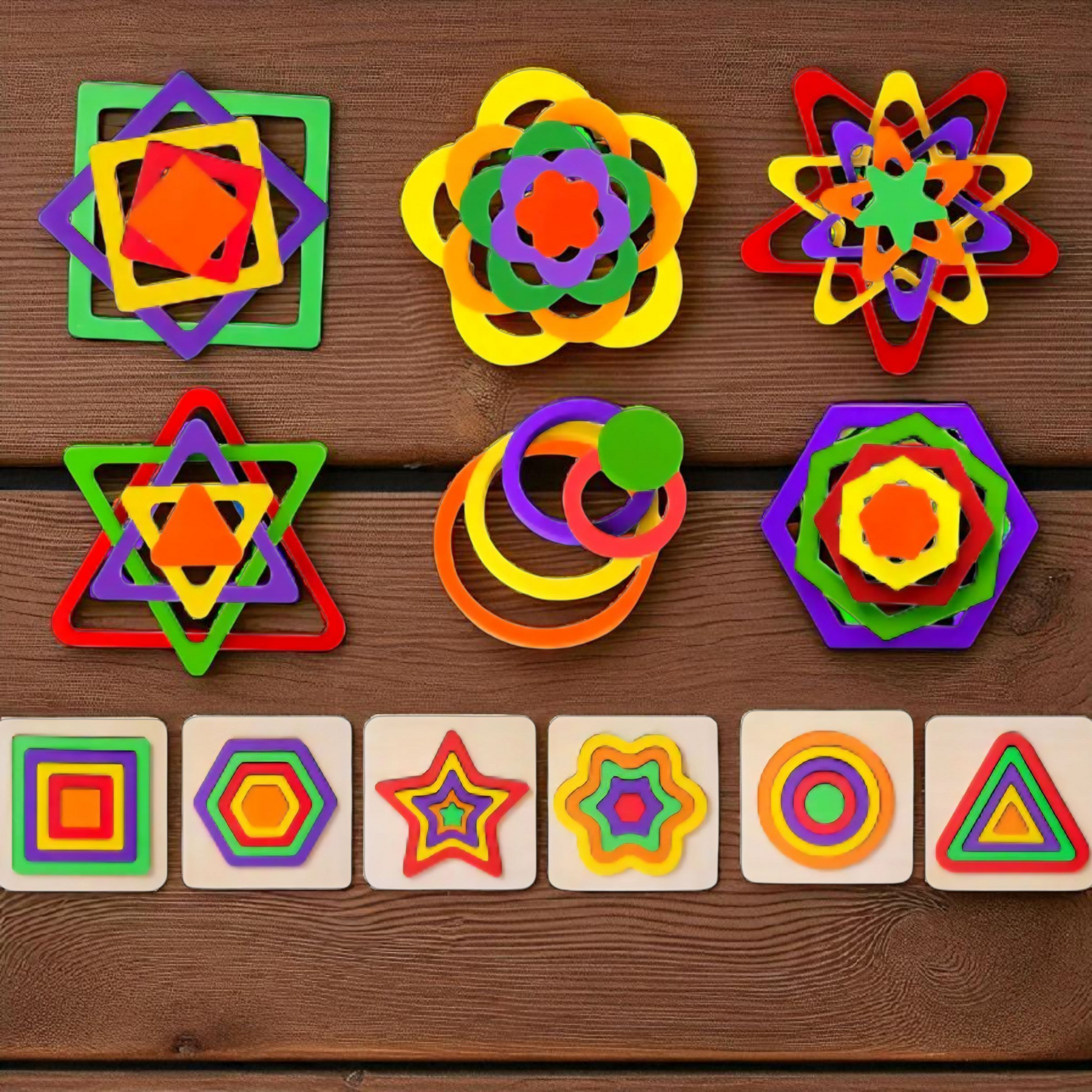 Make learning shapes, colors, and sizes a hands-on adventure! This Montessori-inspired wooden puzzle set includes six shape boards — flower, square, circle, triangle, star, and hexagon — each with matching wooden blocks. Perfect for developing problem-solving skills, hand-eye coordination, and shape recognition in young children.