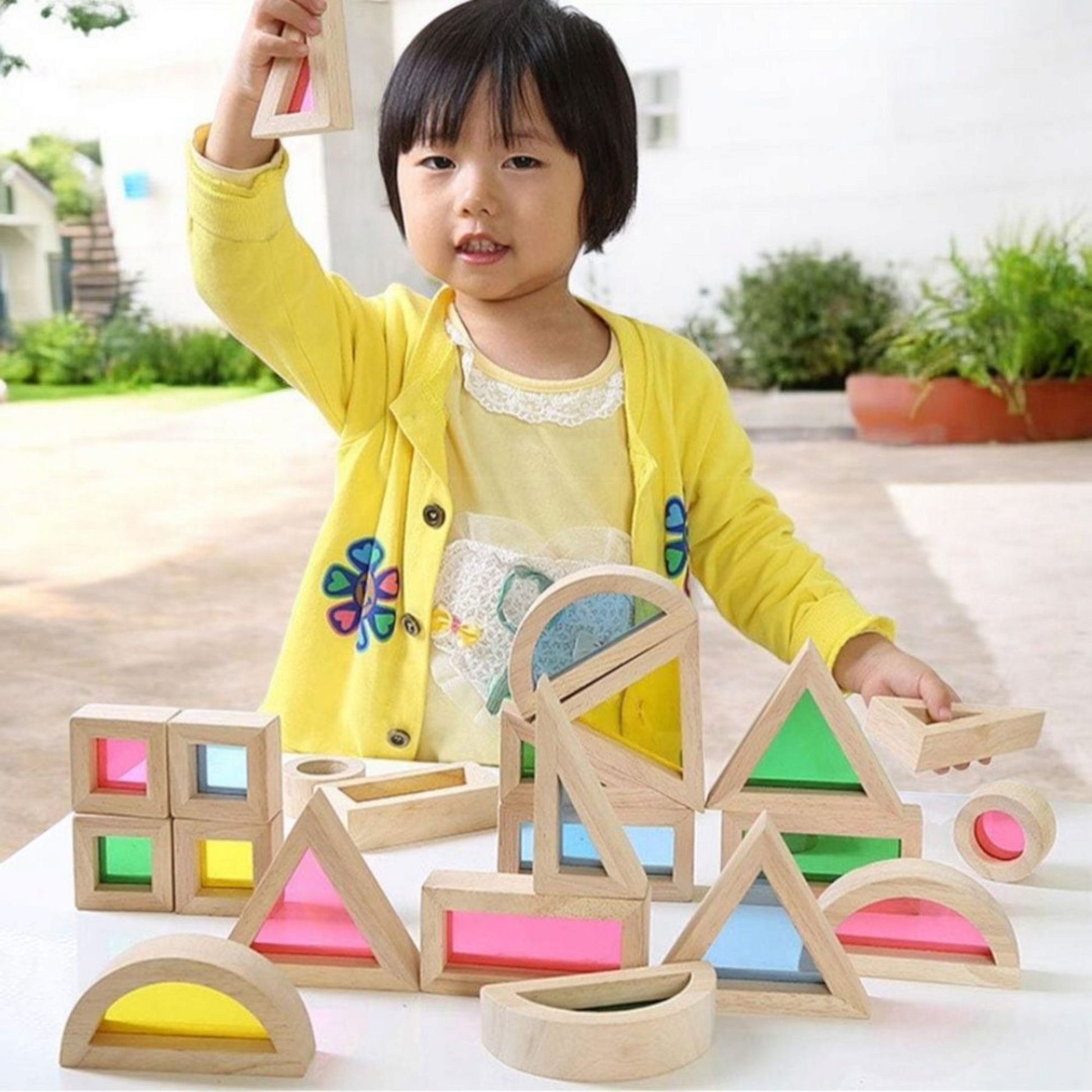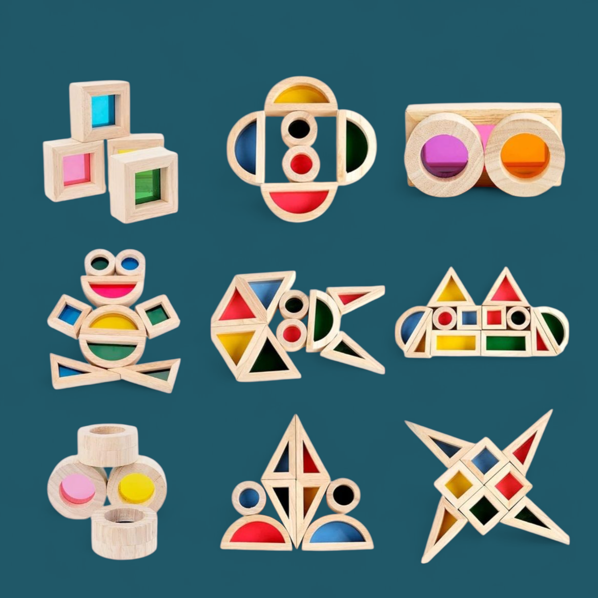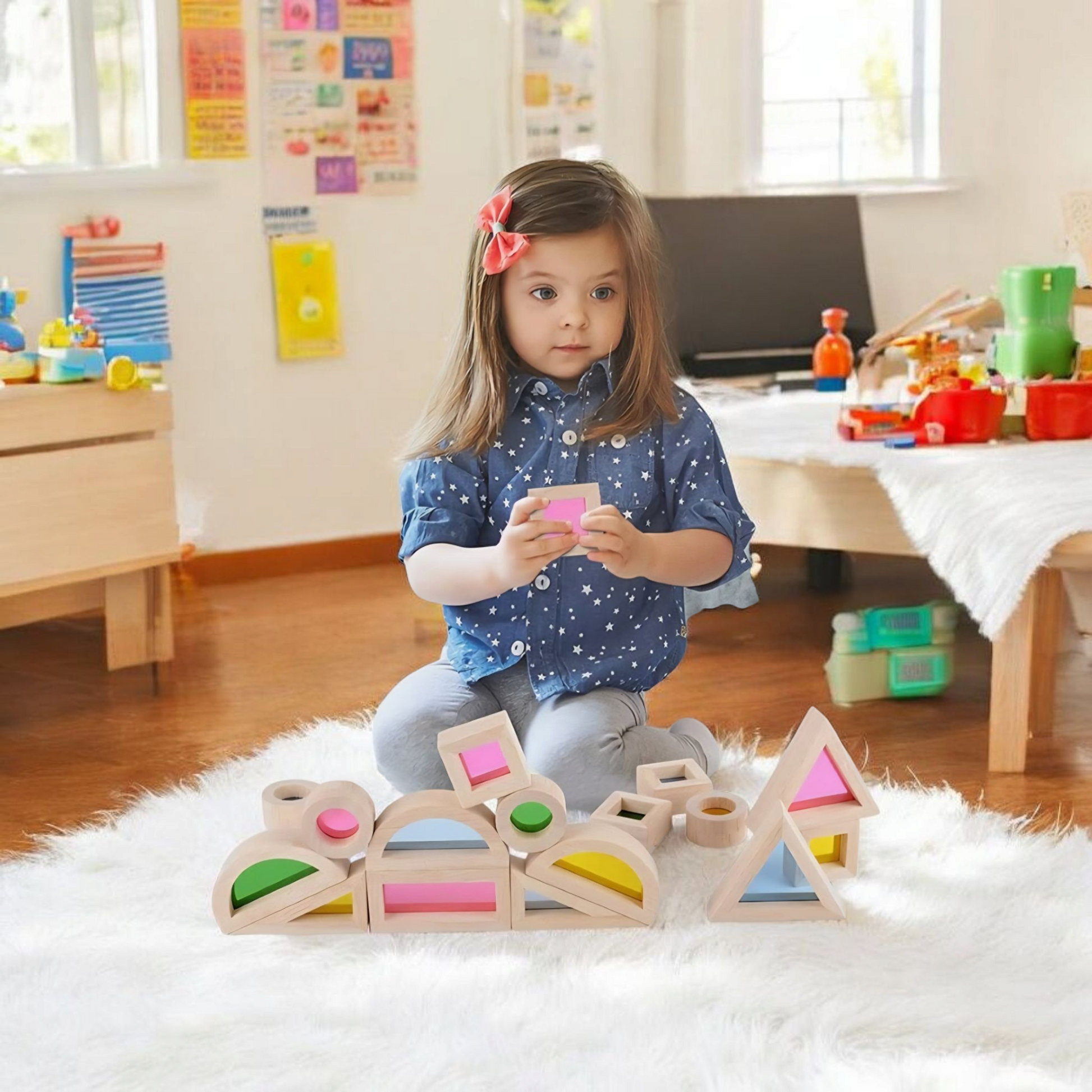 Let creativity shine—literally—with our 24-piece Rainbow Window Wooden Block Set! These vibrant, light-filtering blocks bring a magical twist to classic block play, blending color exploration with hands-on building fun. Crafted from smooth, high-quality hardwood and non-toxic materials, each block is designed to be safe for little hands and durable for years of imaginative play.