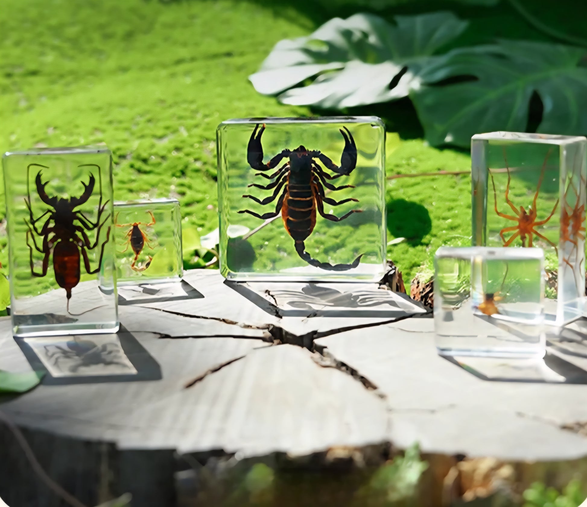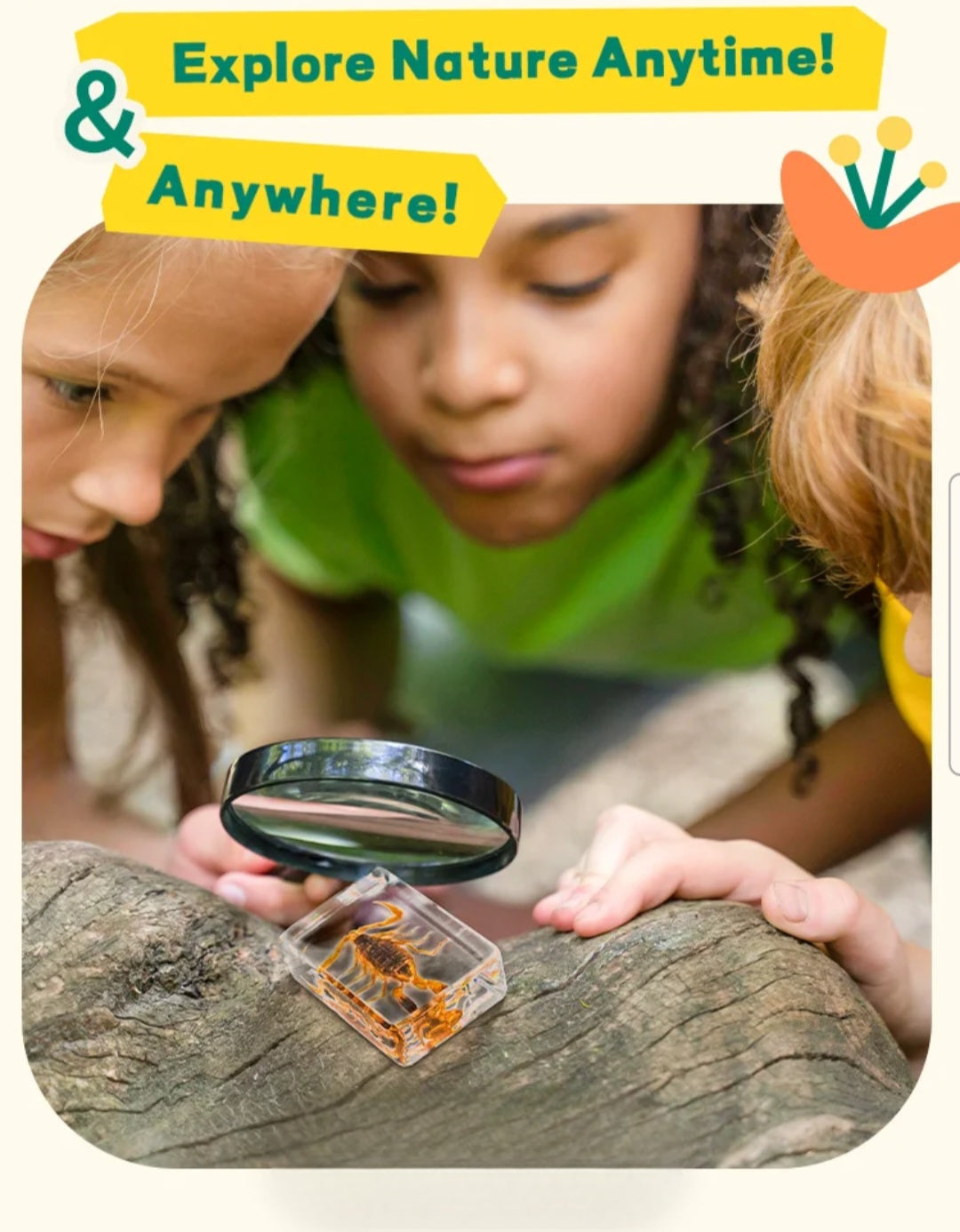 Get up close with creepy crawly friends! This set includes real insects preserved in crystal-clear acrylic, such as a ladybug, beetle, scorpion, grasshopper, and more.