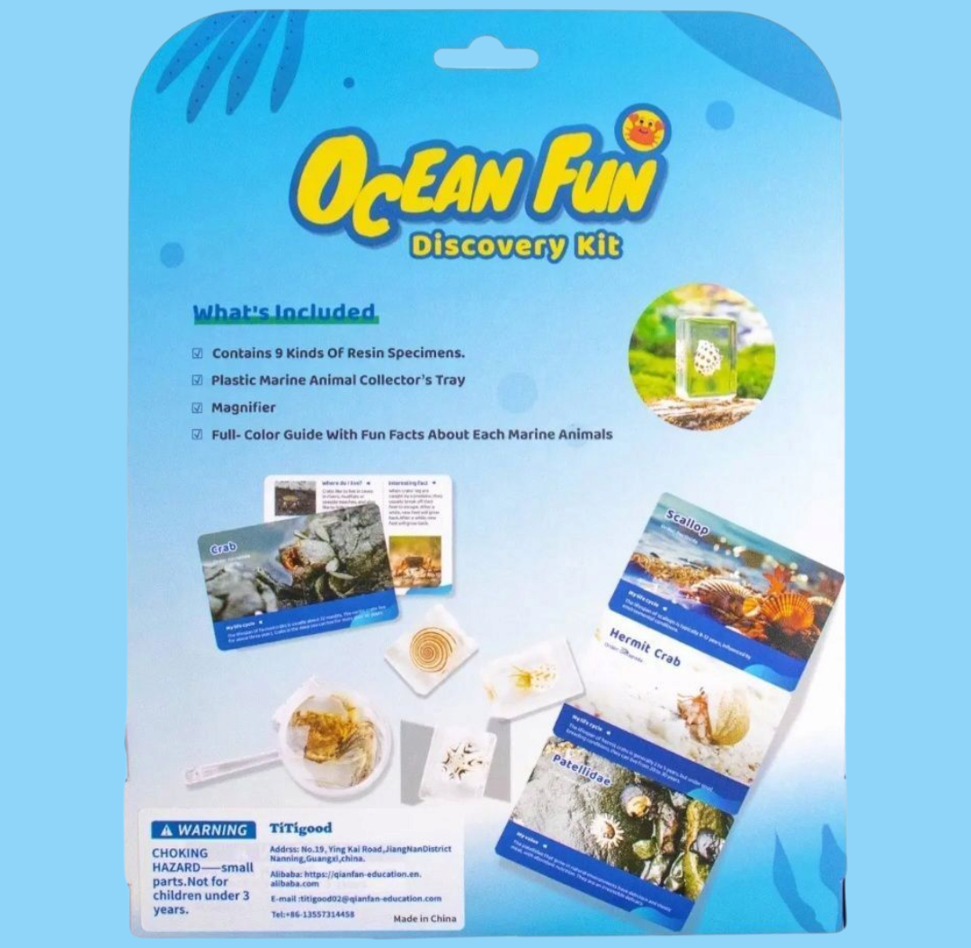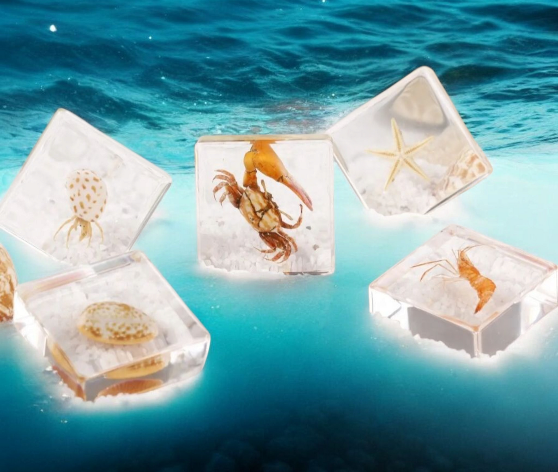 Dive into marine life! This kit features real sea creatures preserved in resin, including shells, a seahorse, starfish, crab, and other fascinating marine animals.