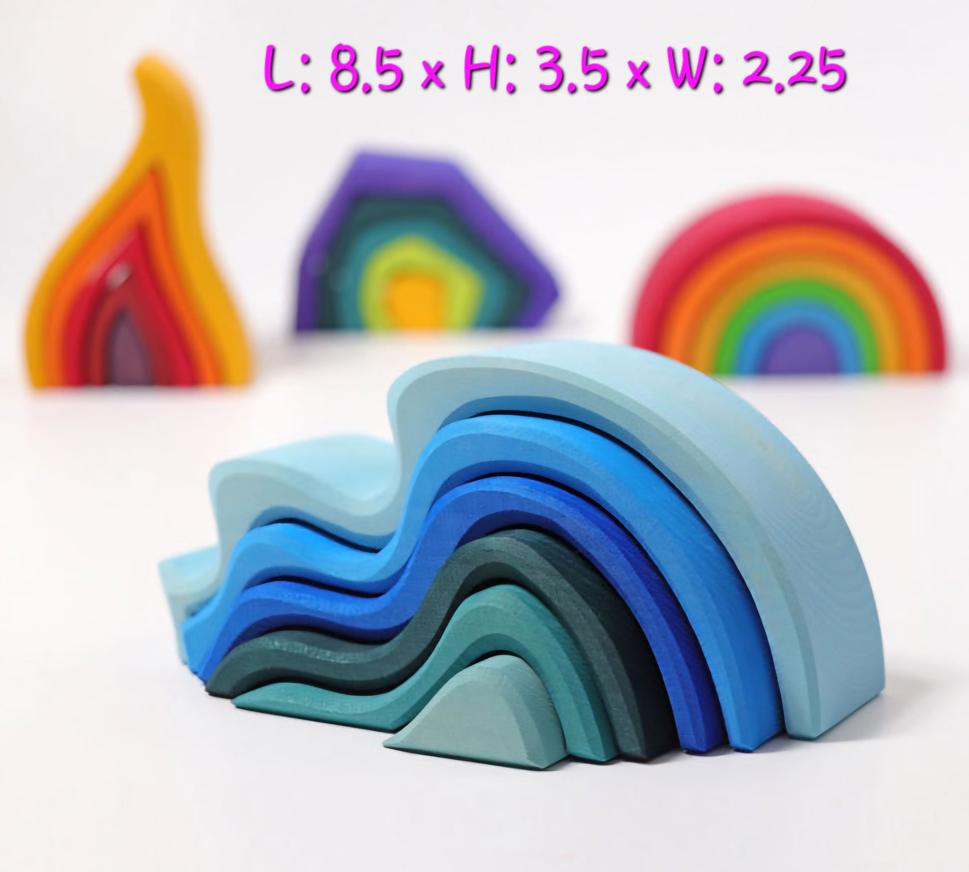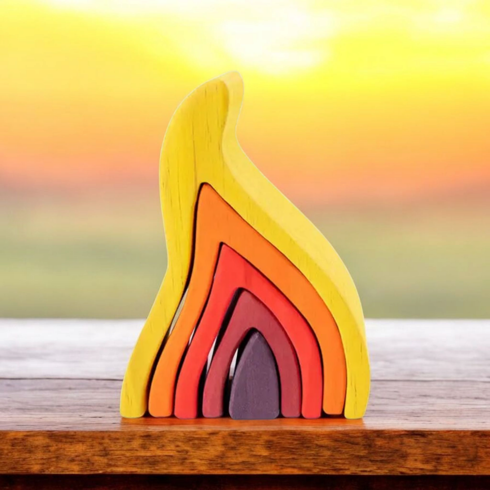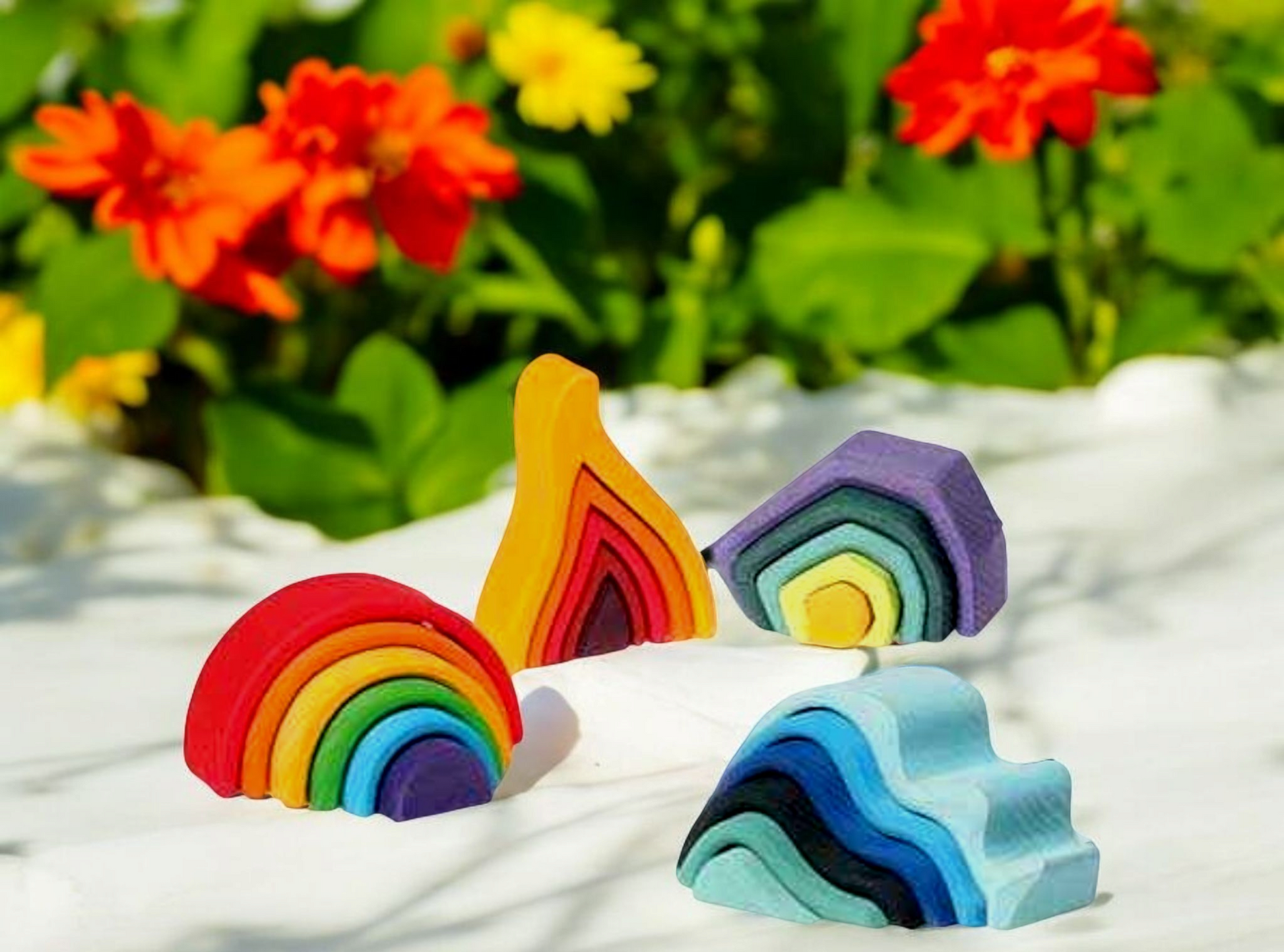 4 beautifully crafted wooden toys for $175.00. Earth, Waves (water), Flame (fire) and Rainbow (air)!