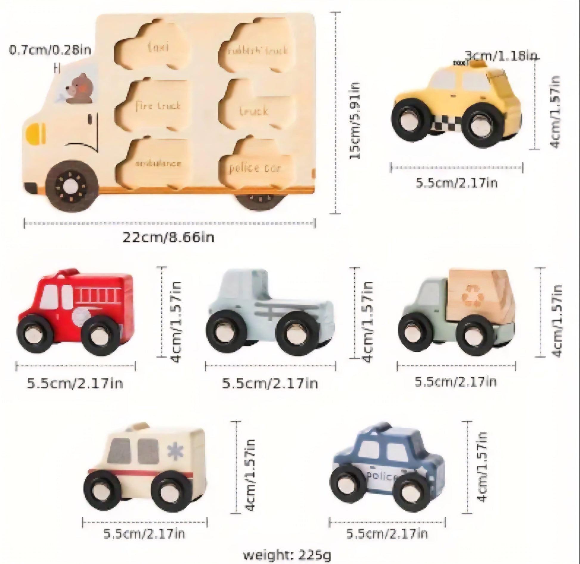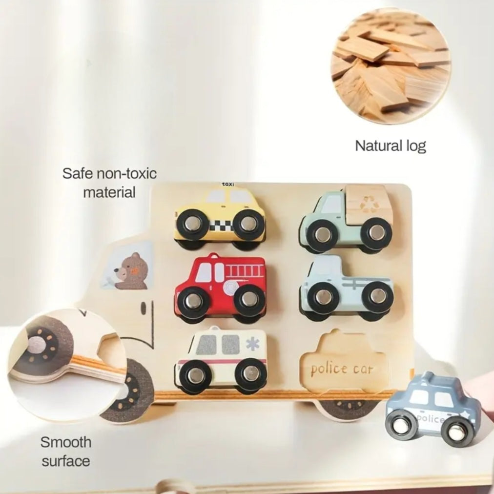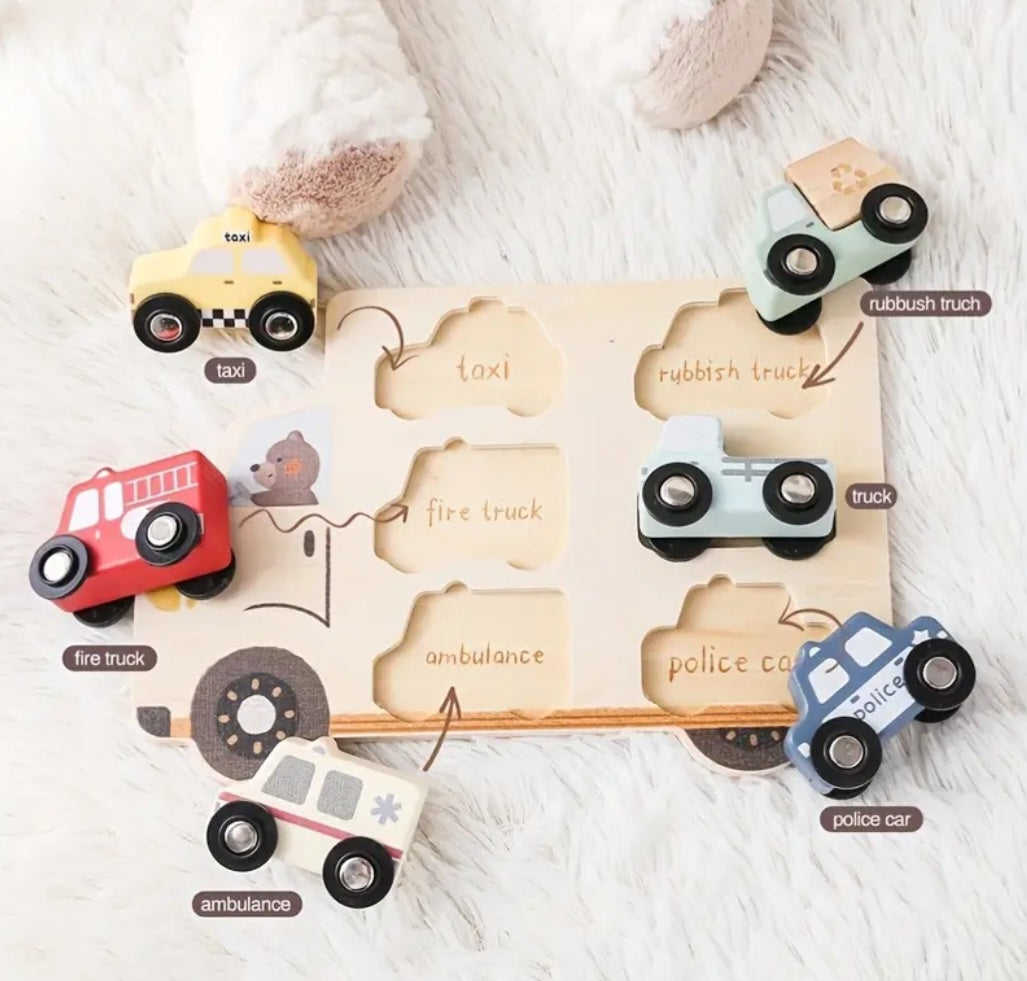 6 wooden vehicles: Fire Engine, Police Car, Taxi, Ambulance, Garbage Truck, and Pickup Truck