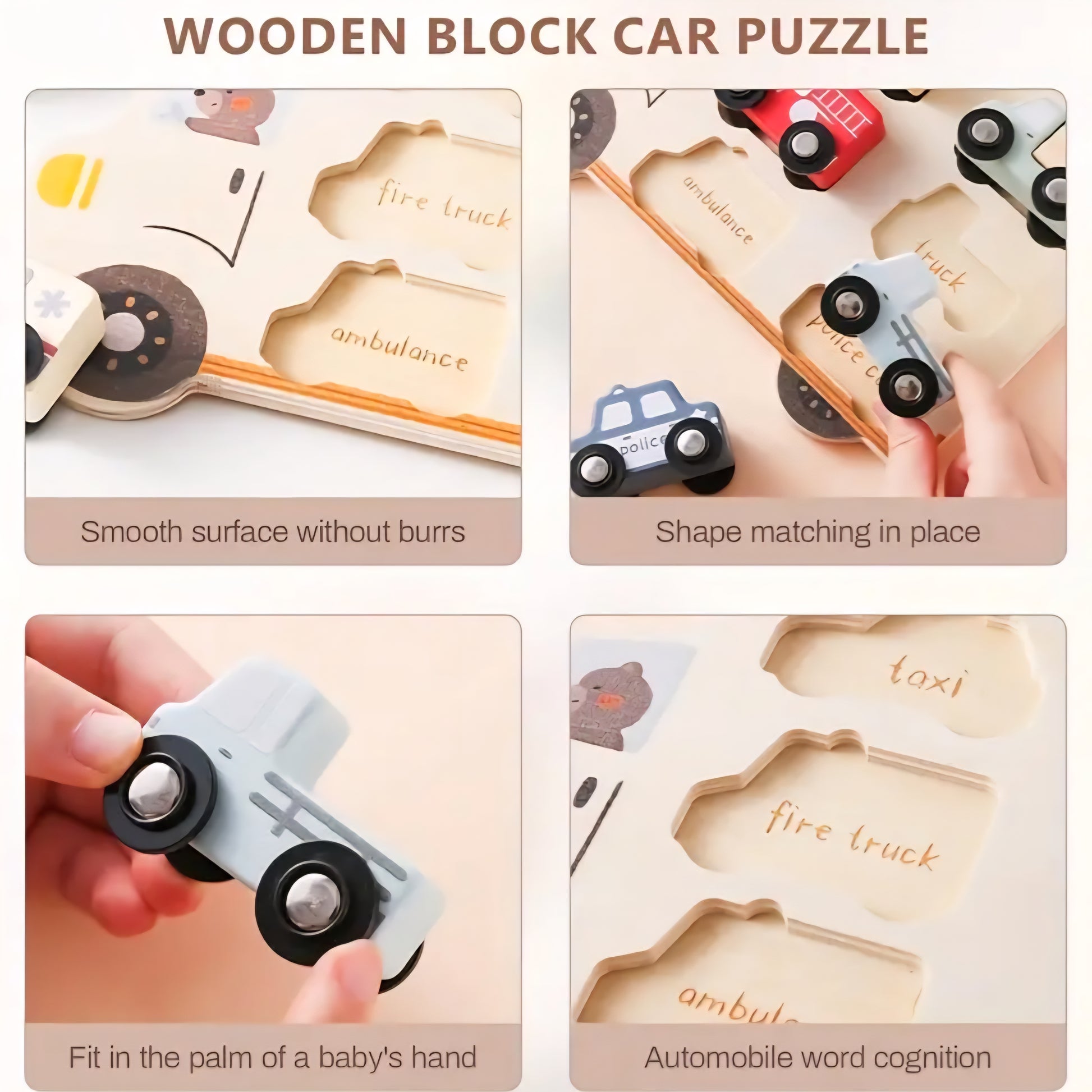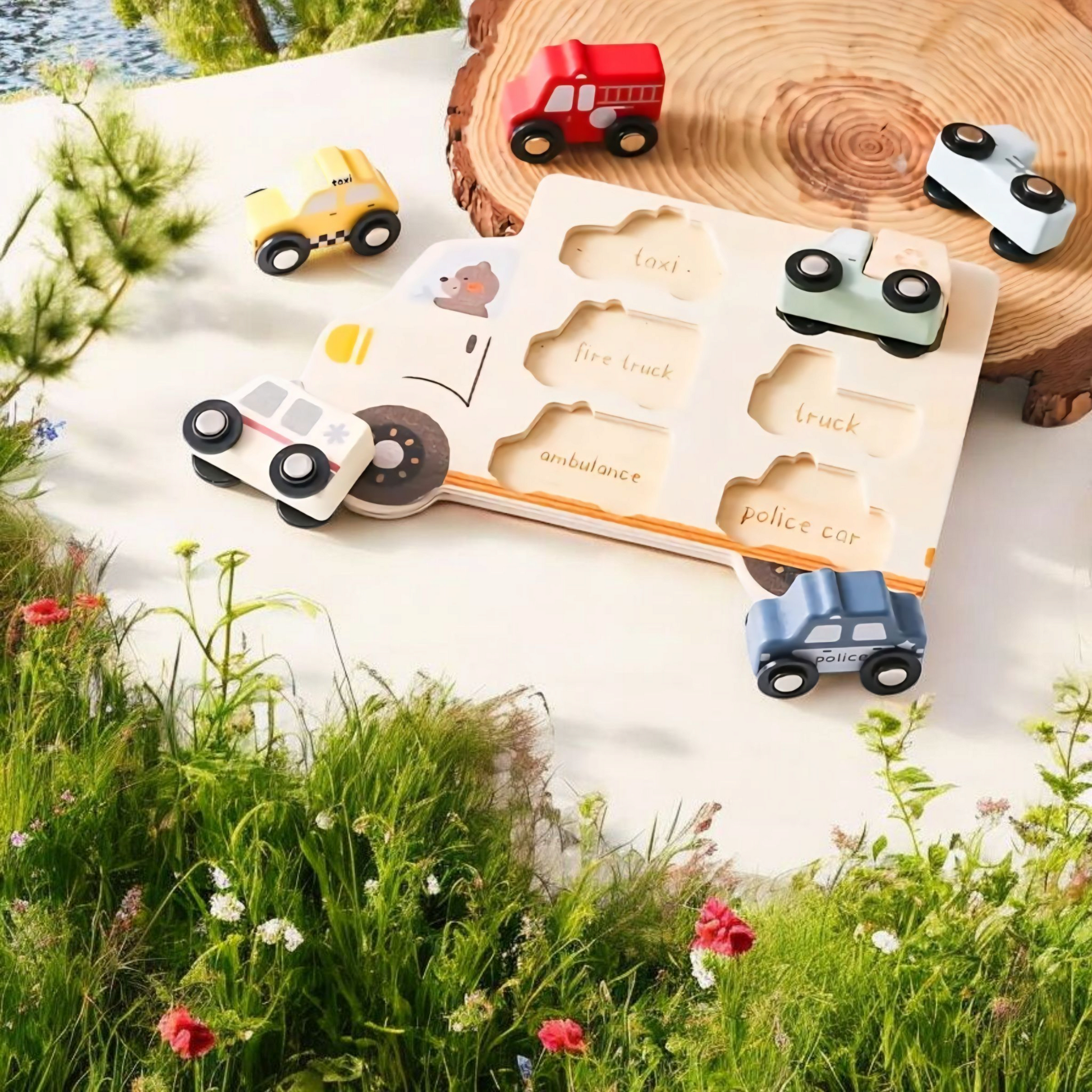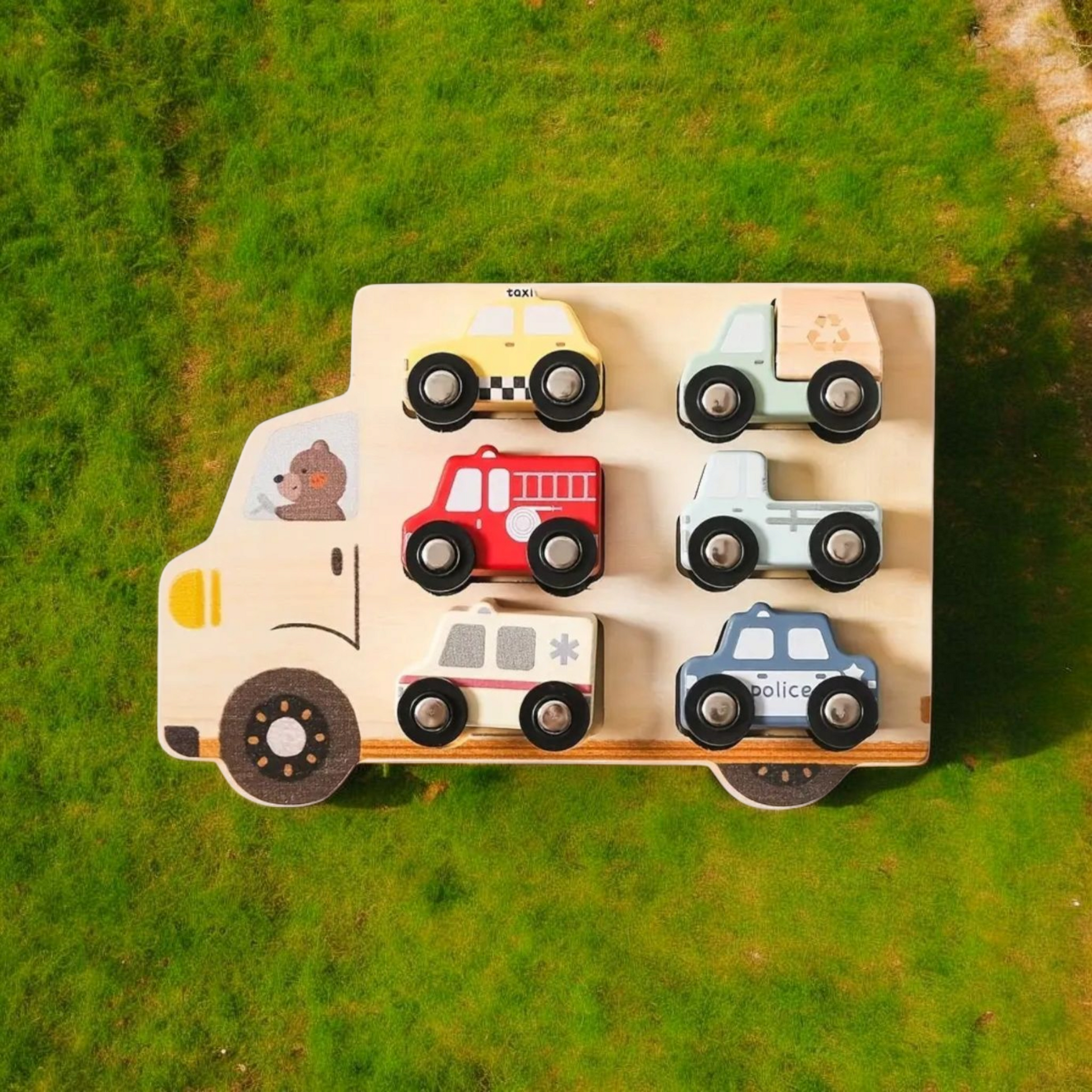 6 wooden vehicles: Fire Engine, Police Car, Taxi, Ambulance, Garbage Truck, and Pickup Truck