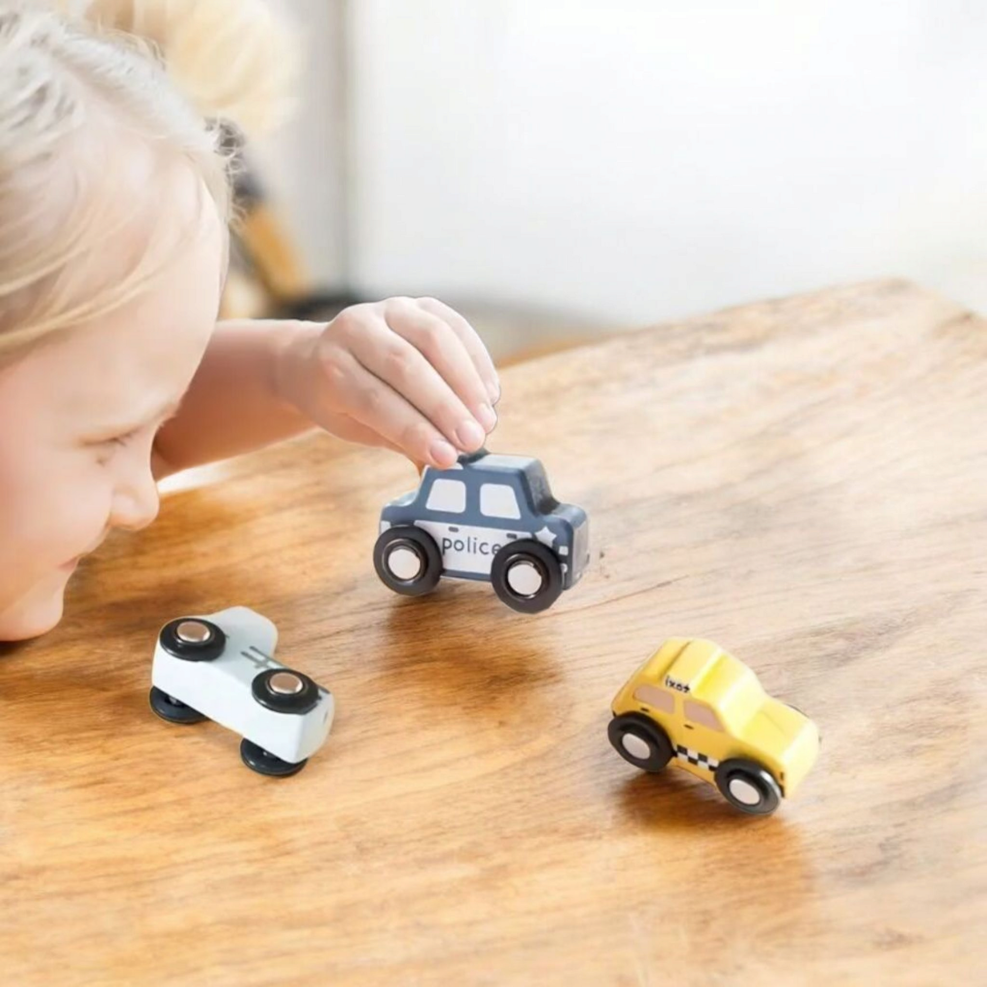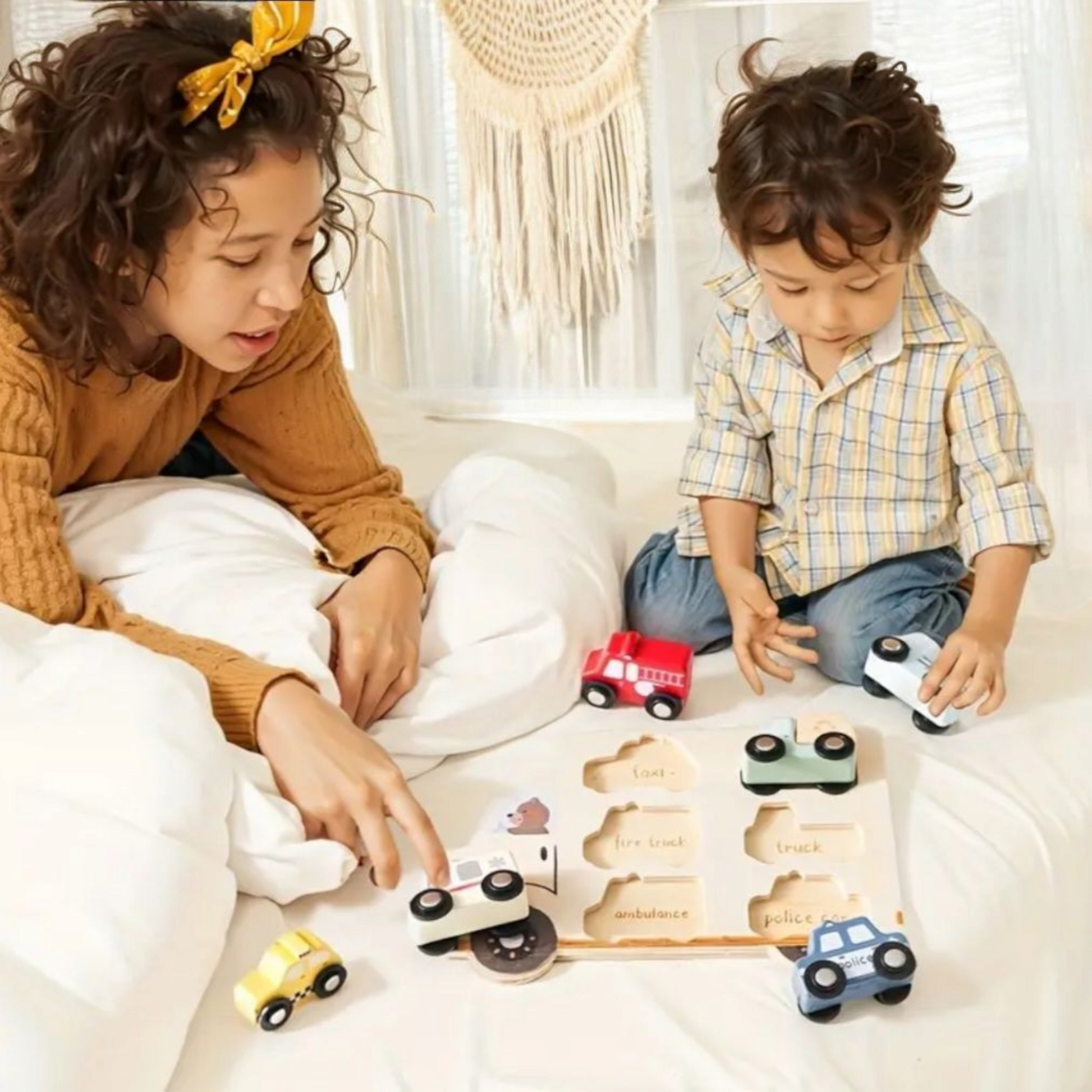 Let little imaginations race with this colorful wooden vehicle set! Featuring a fire engine, police car, taxi, and more, this set encourages open-ended play, role exploration, and fine motor development.