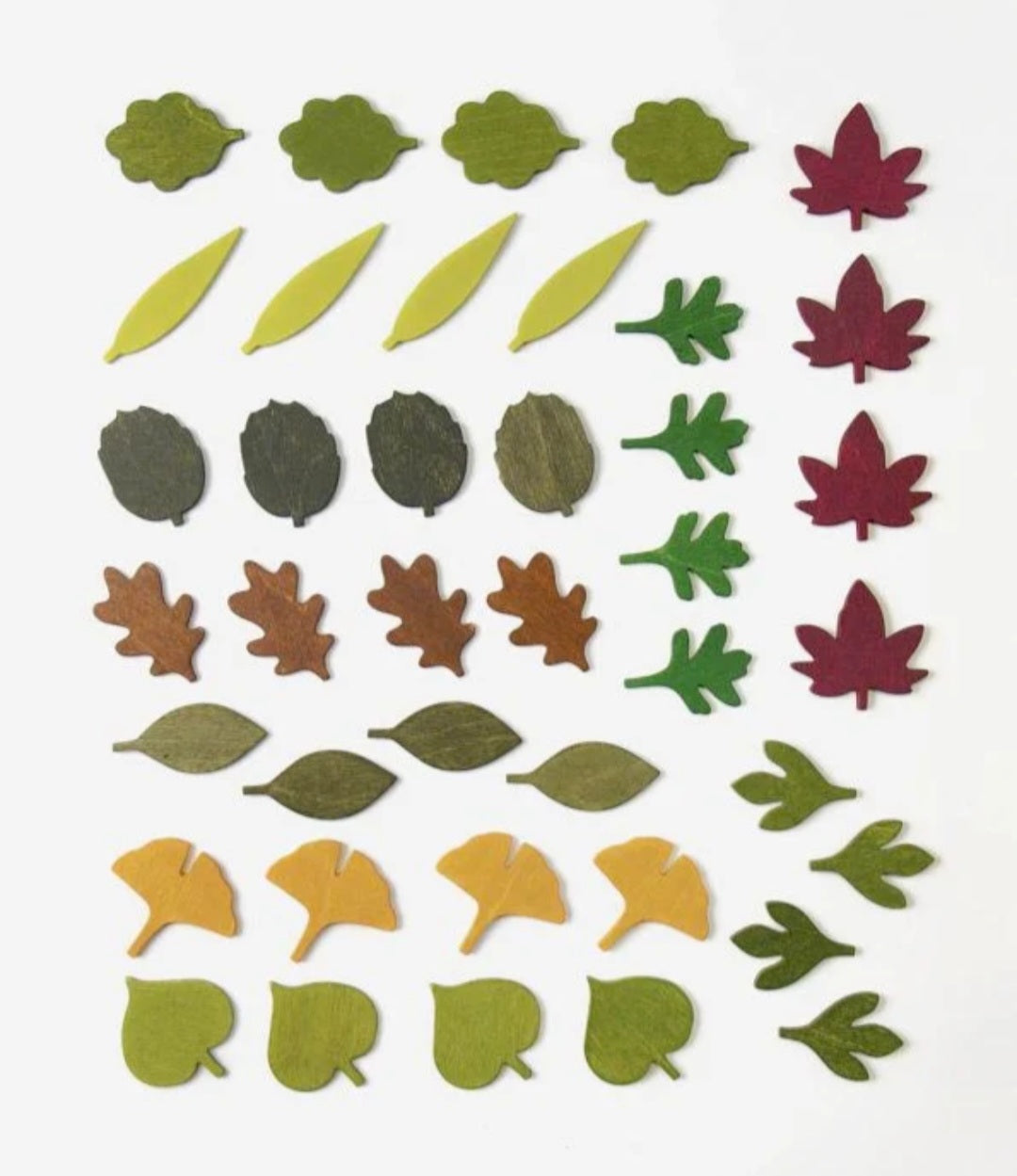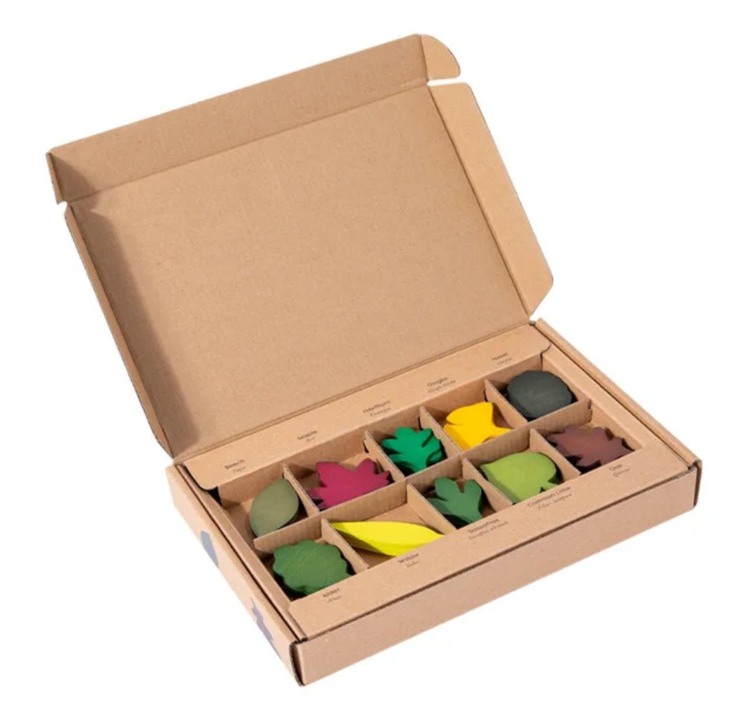 Set Includes: 40 wooden leaves (4 of each design) in a presentation box with leaf names for added learning.