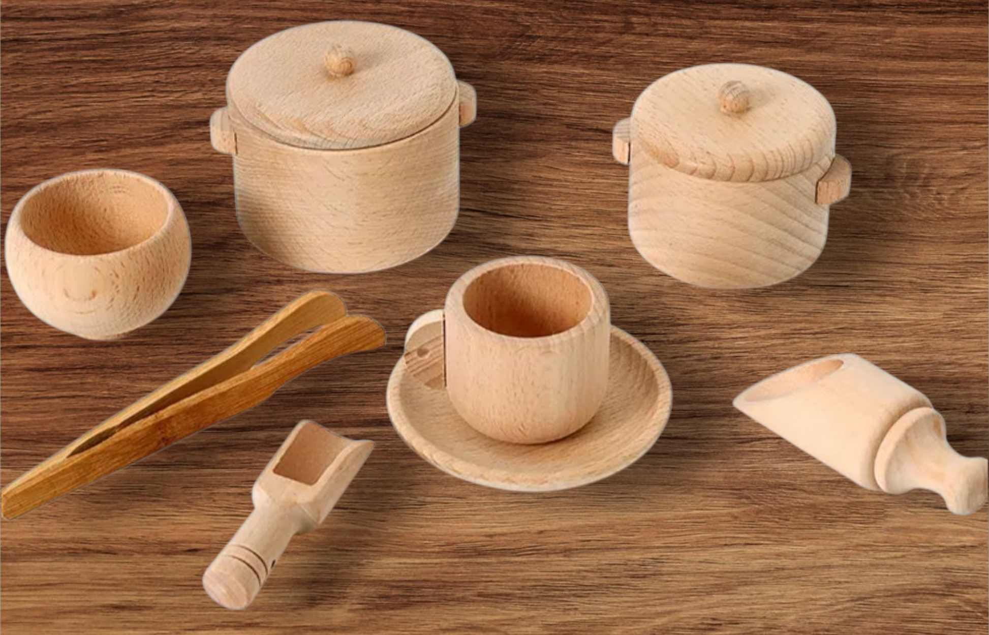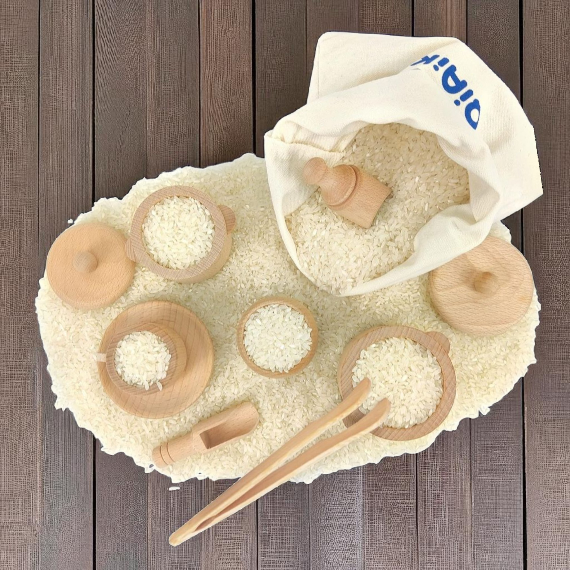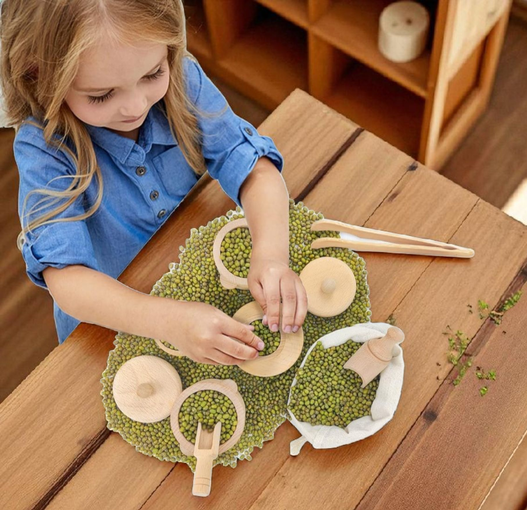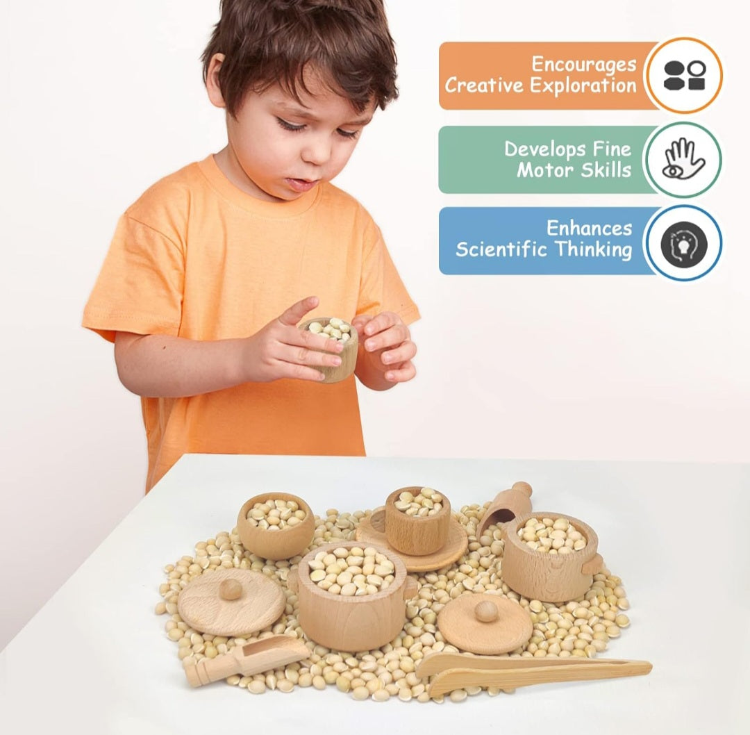 Montessori Learning at Home: Includes wooden bowls, scoops, tongs, and containers designed for pouring, scooping, transferring, and sorting activities.